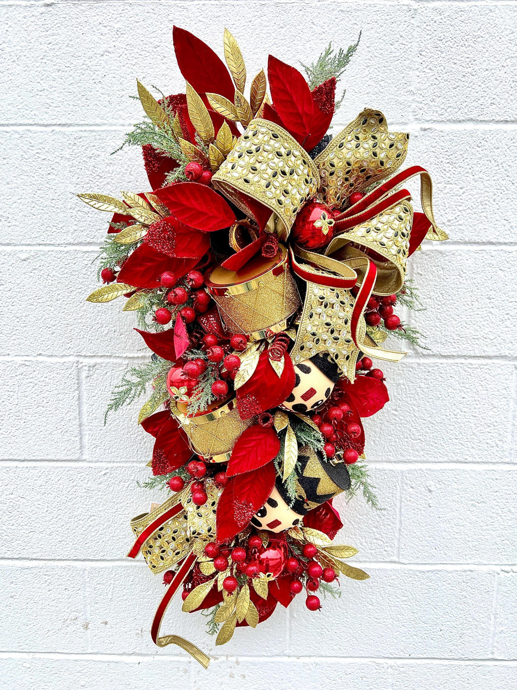 Red Velvet & Glitter Magnolia Leaf Spray - 25 inches