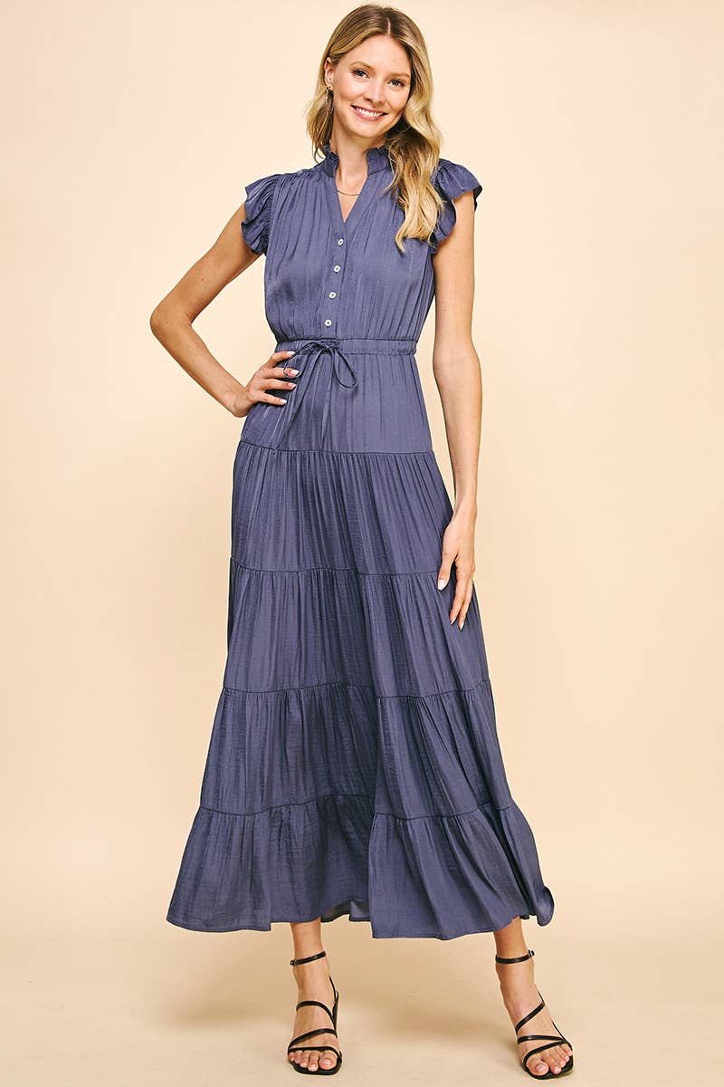 Tell Me Everything Satin Tiered Maxi Dress: DUSTY NAVY
