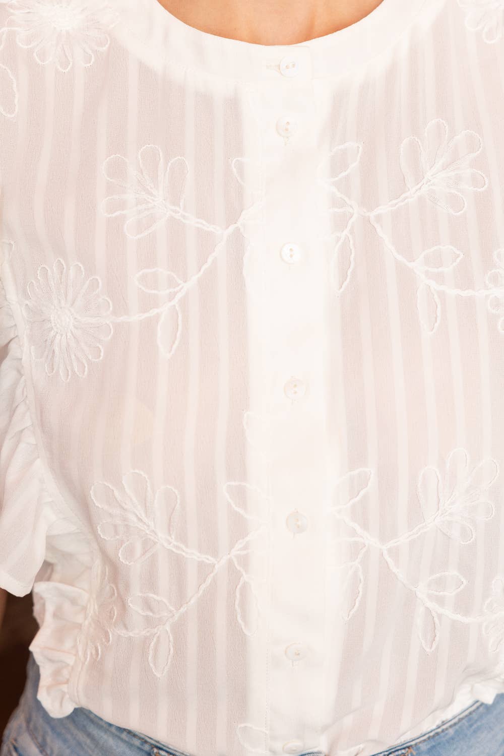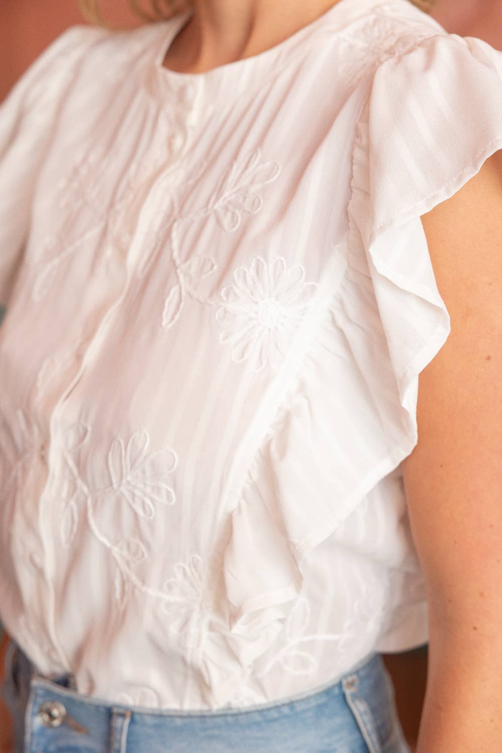 Experience the moment in this embroidered ruffle sleeve top! The round neckline and front button up closure make it easy to wear, while the floral embroidered woven fabric adds a touch of elegance. Treat yourself to a moment of beauty and grace with this top!