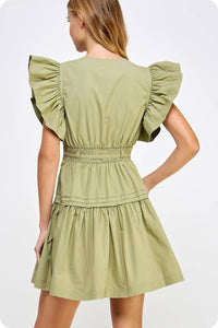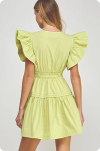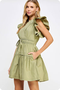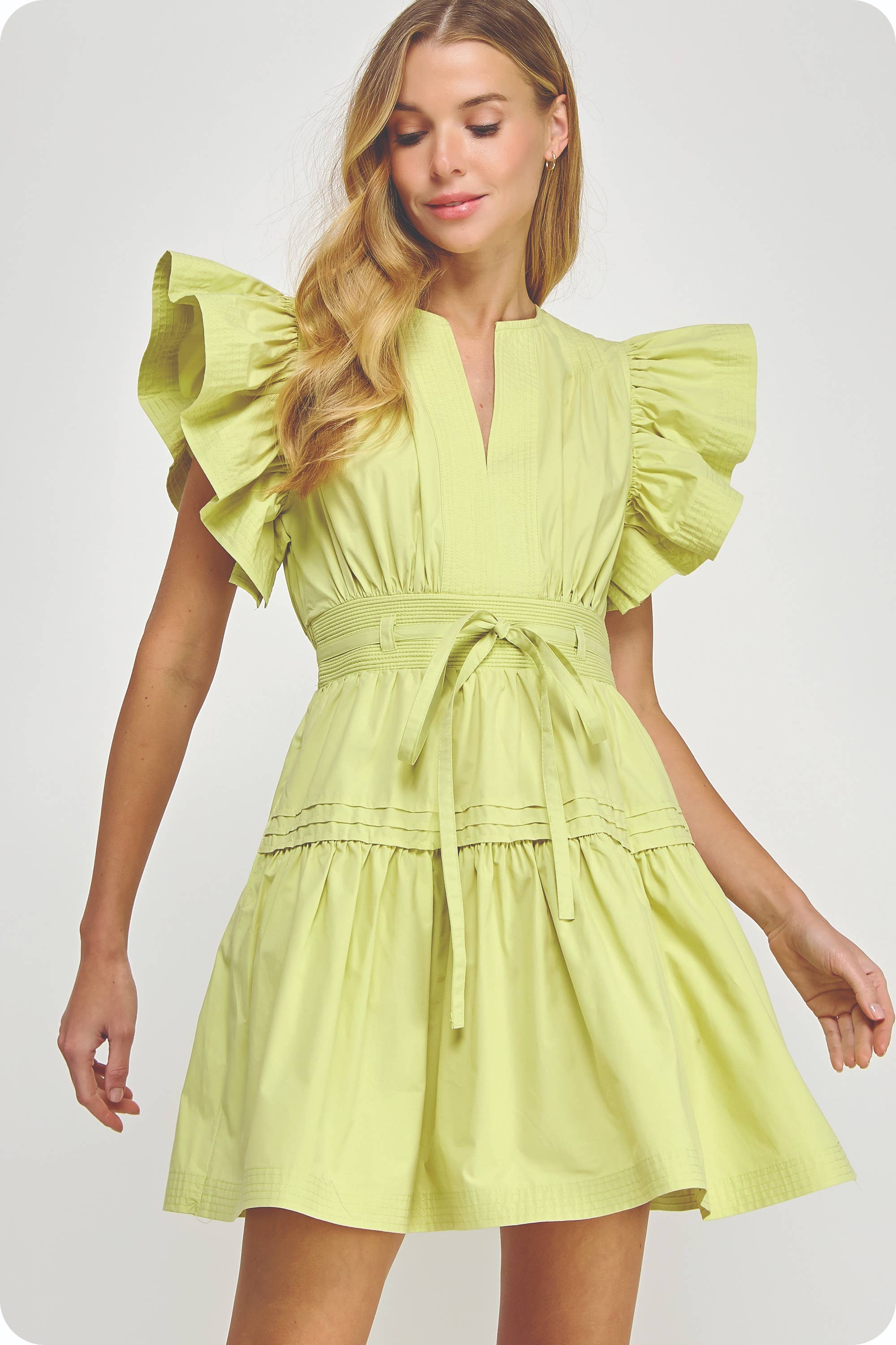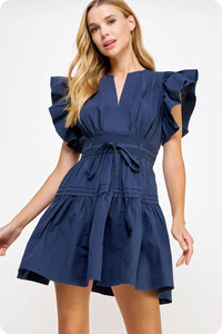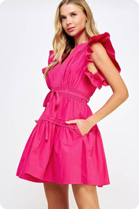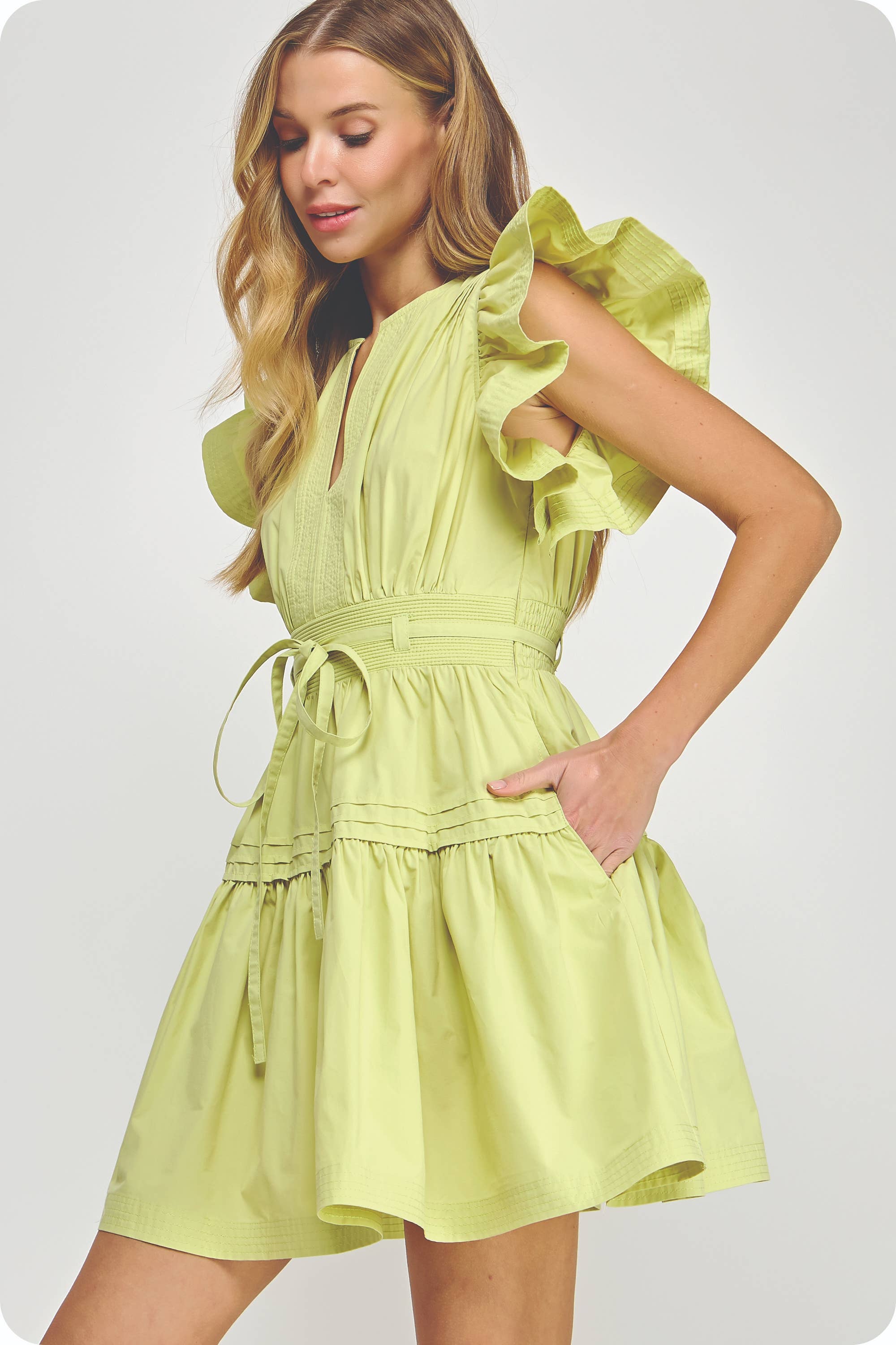 Get ready to turn heads in the Lucky Me Flutter Sleeve Poplin Mini Dress. Made of soft, breathable cotton poplin, this mini babydoll dress features fluttered ruffle sleeves and a removable waist tie for a flattering silhouette. With practical details like side pockets and a side zipper closure, this dress is both stylish and functional. Create a playful, feminine look with the pin-tuck detail and cinched banded waist.