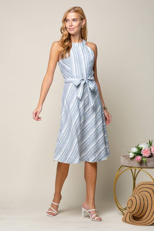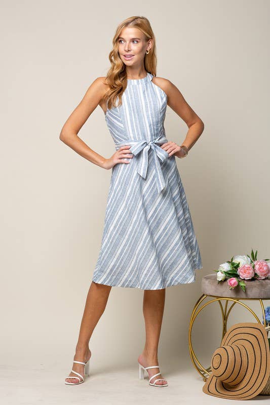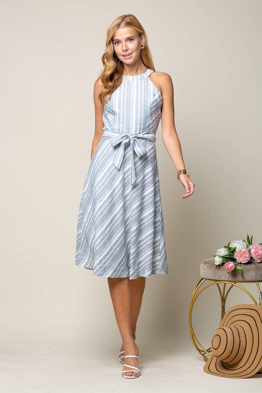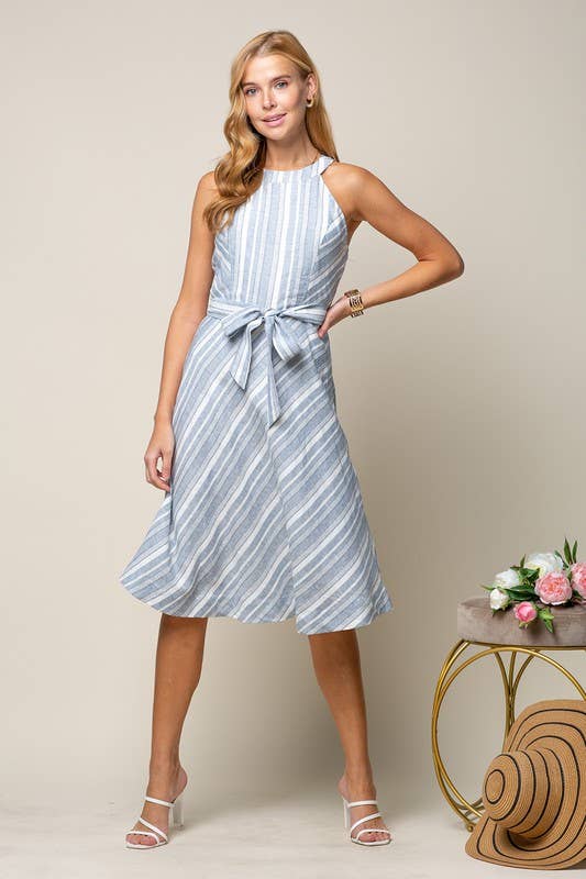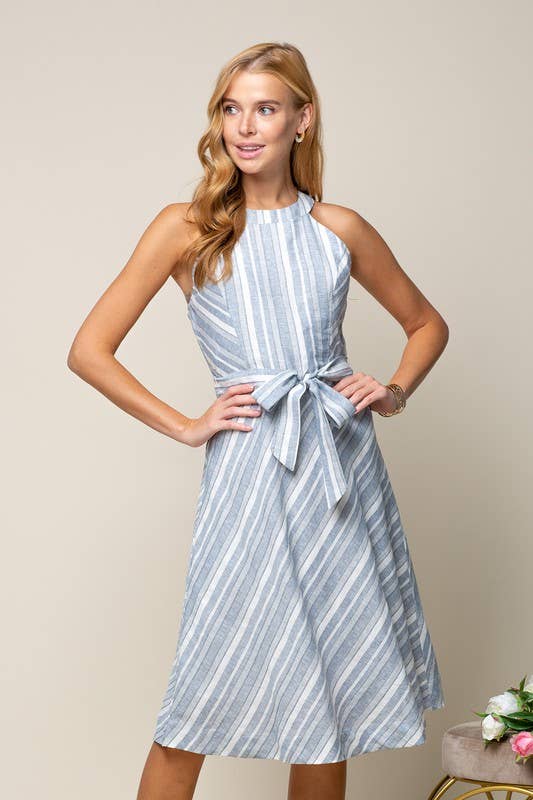 Experience instant charm with the Love At First Sight Chambray Striped Halter Dress, designed to captivate and flatter with its timeless striped pattern and elegant halter neckline.